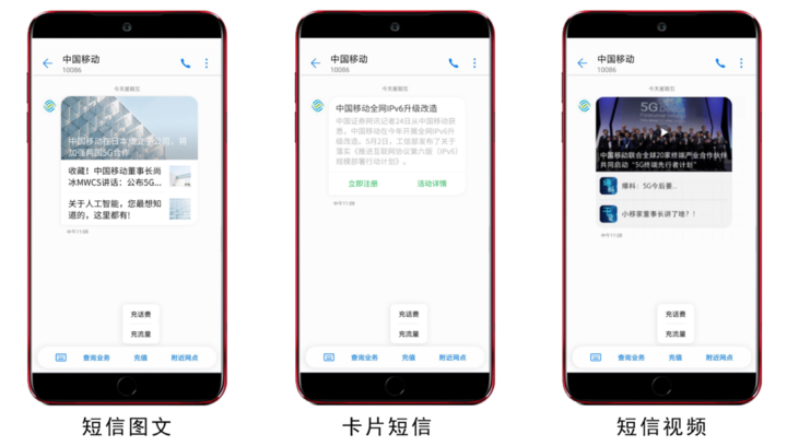 魅族和中国移动曾在 MWC 2018 大会中展示过基于 RCS 短信核心的「Flyme 智慧短信」企业能在短信框内顺利获得图文卡片、功能抽屉、短信流量红包发布消息。实际上我们现在使用华为、vivo、OPPO、小米等品牌手机打开中国移动等企业短信时,也能看到 RCS 短信功能的雏形。顺利获得短信框内的功能抽屉,用户能直接查询、充值或者直达企业官网办理业务,免除用户退出短信再打开 App 登录的多次操作。
